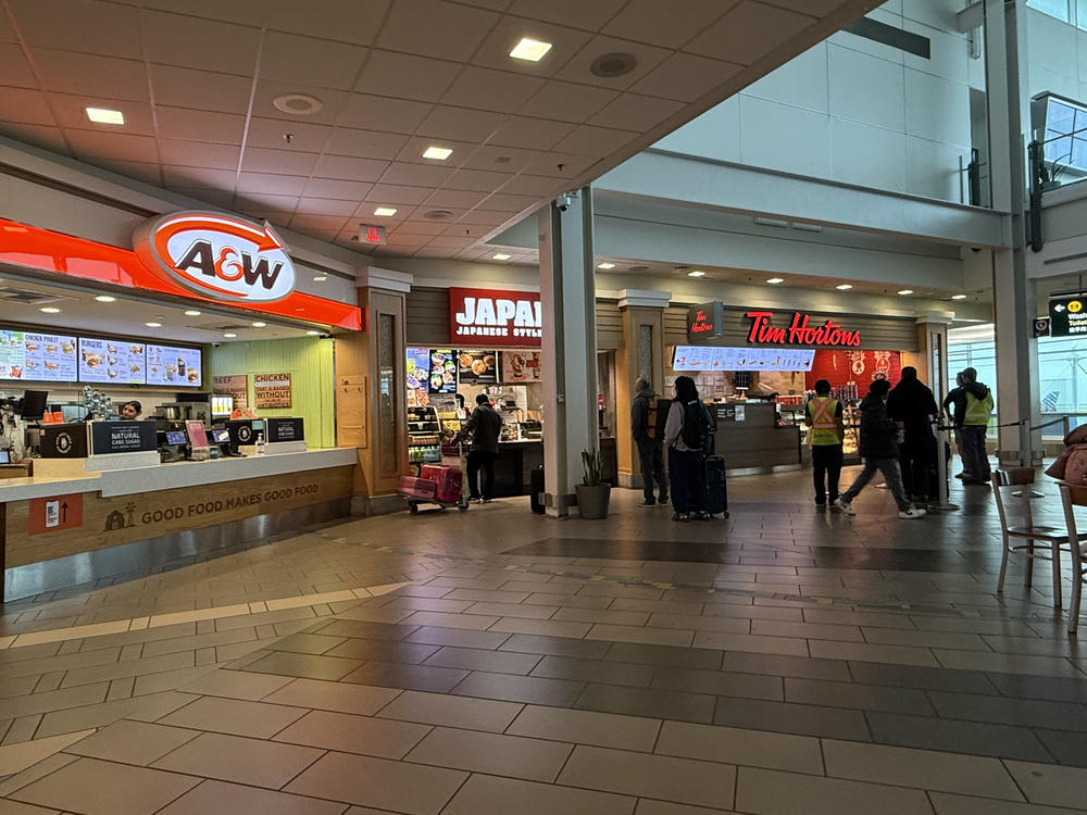 If you are hungry, the area before entering features A&W, Subway, and iconic Japadog and Tim Hortons stand. If you have time, head to the observation deck via the escalator for a great view of the airfield.