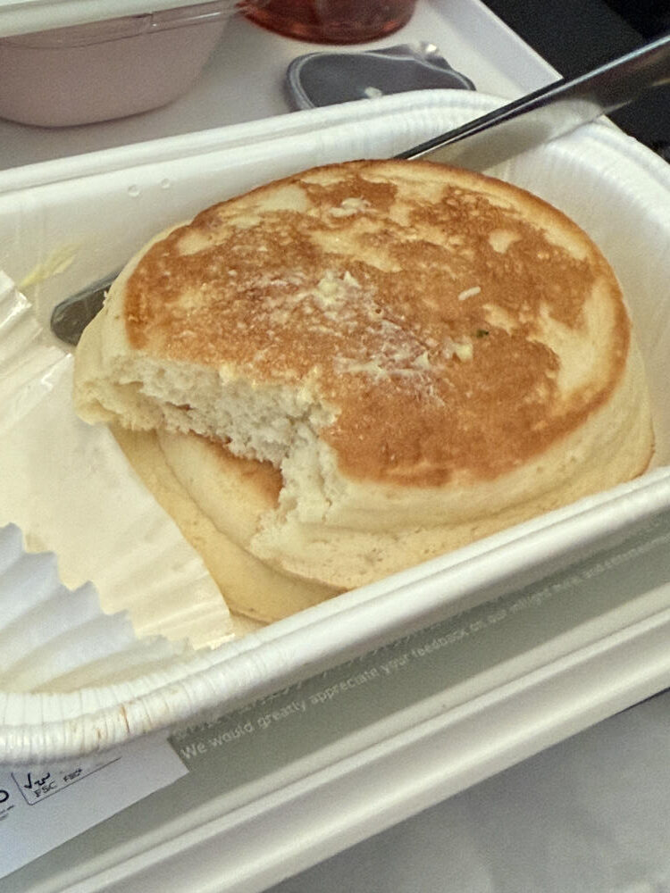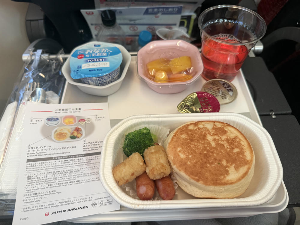 Breakfast: The western-style breakfast included a Soufflé Pancake—genuinely fluffy, not dry, and a shock to find in an economy meal