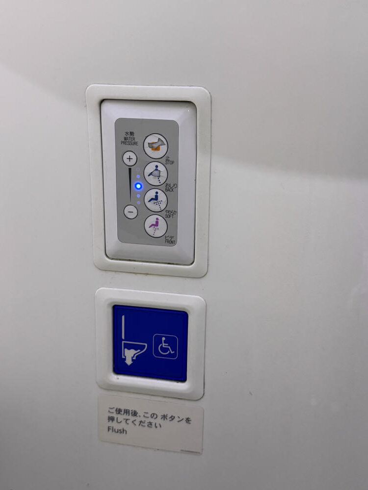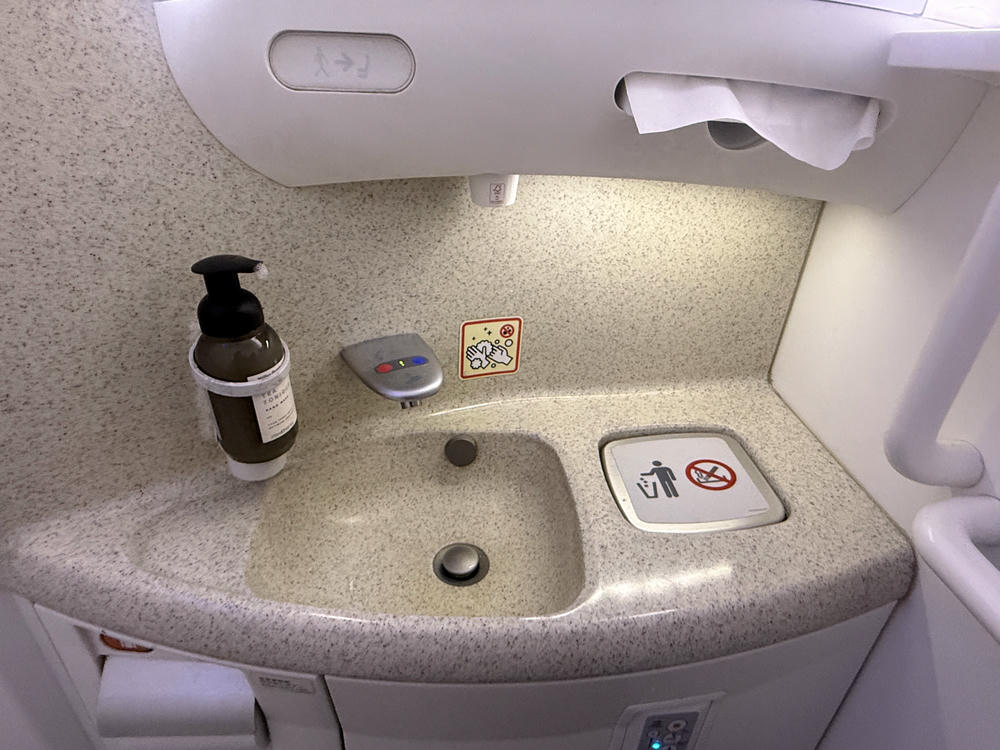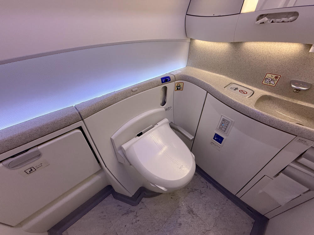For a long-haul flight, the lavatory experience is vital. The rear lavatory on this 787-800 is wheelchair-accessible and incredibly spacious. Most surprisingly, it featured a washlet (bidet toilet), which is standard in Japanese hospitality but rare in the sky.