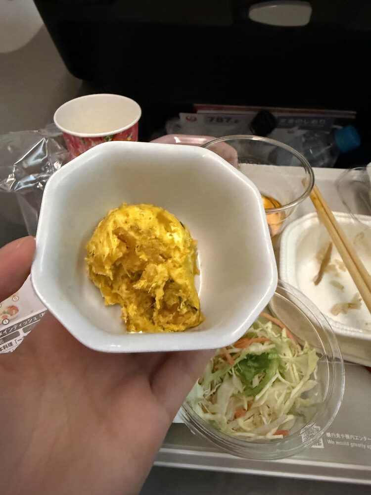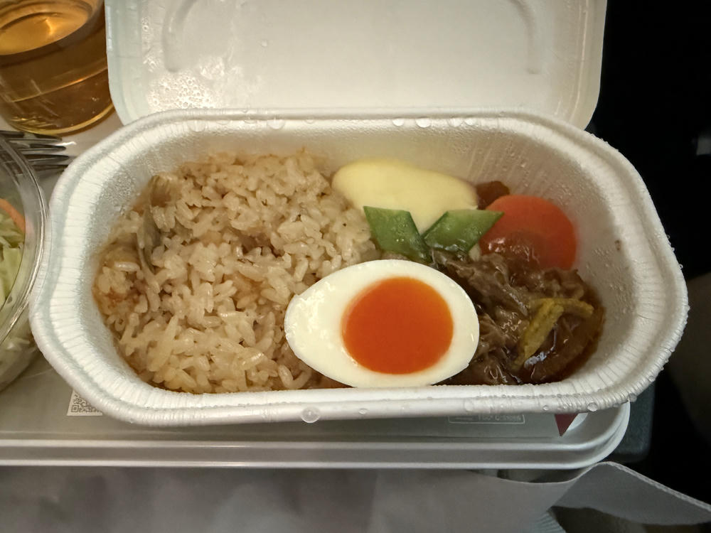 The rice dish featured a perfectly cooked soft-boiled egg—first time seeing it at 35,000 feet!