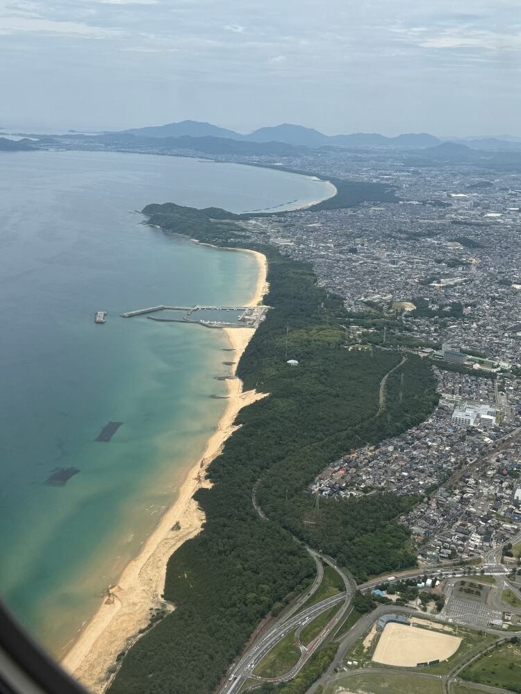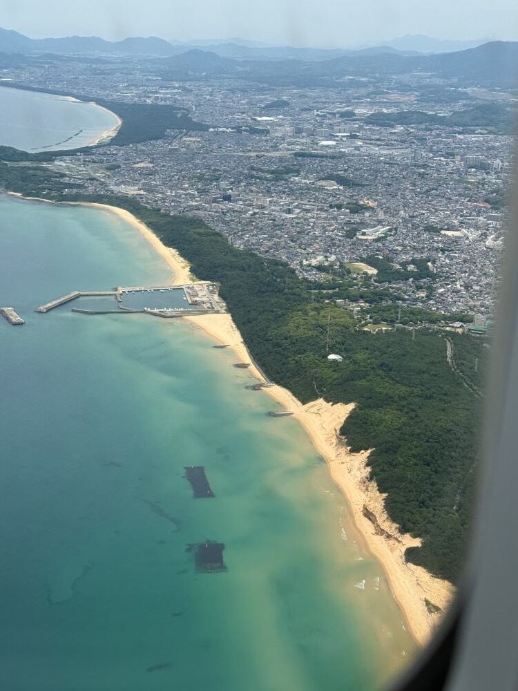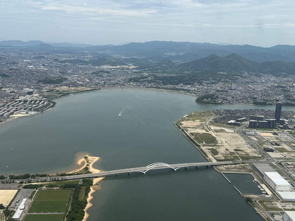 Looking out the window, I discovered Fukuoka’s stunning coastline. I later learned it was near Komo Park, a 30-minute drive from the city center. Also visible: Atago Bridge, connecting the Nishi and Sawara wards.