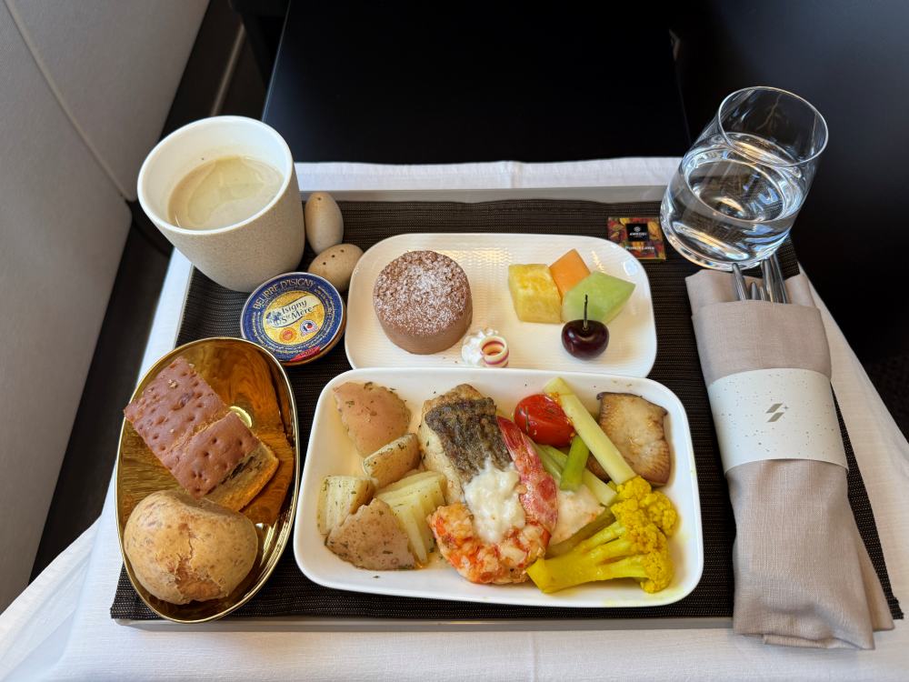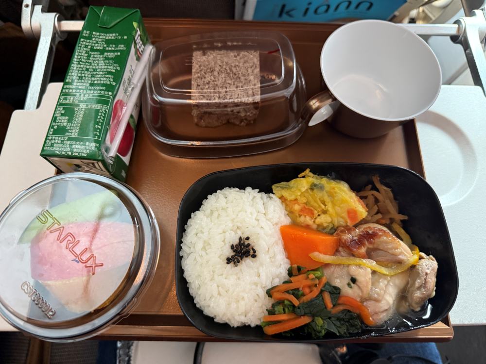 I’ve previously had the STARLUX economy beef rice bowl. This time, I was served chicken thigh, which was… hard to describe. Dessert seemed like a mousse—forgettable. Only the fruit from Taiwan stood out. We have very sweet fruits.