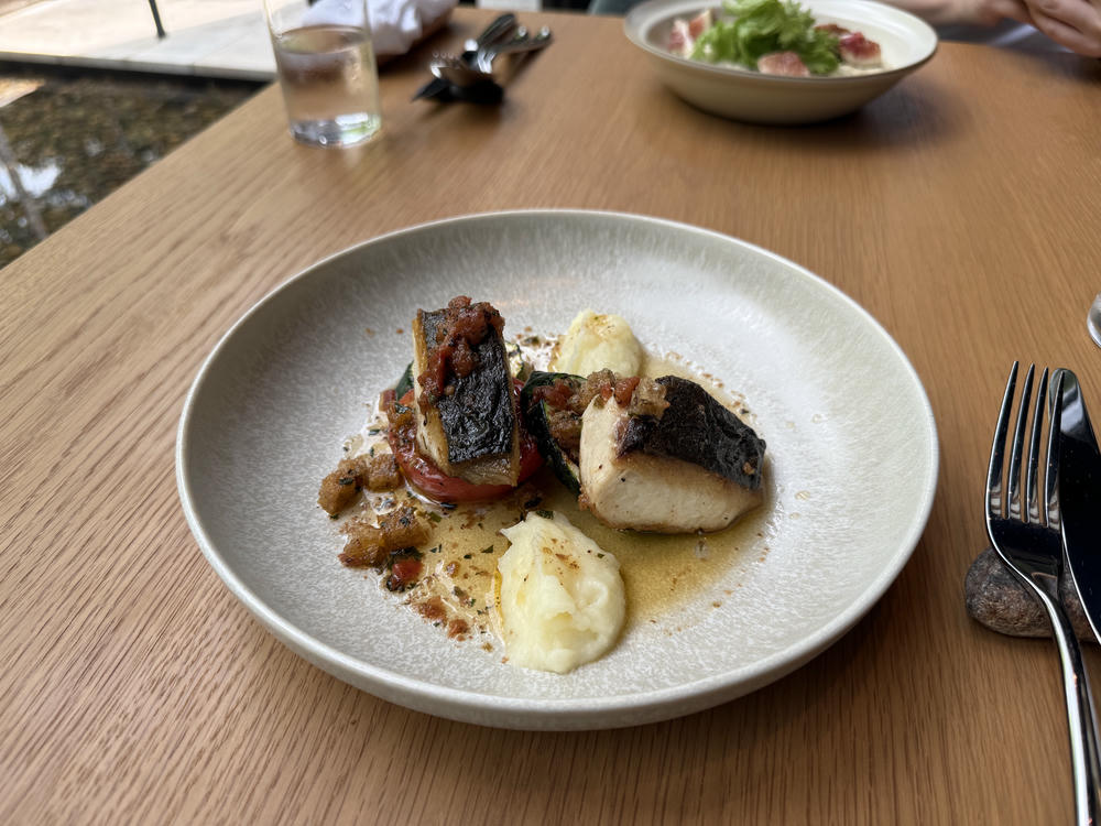 - Seared Spanish mackerel with zucchini, roasted tomato, and potato puree